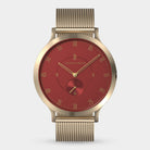 • Design iconique : Cadran rouge mat, boîtier doré brossé de 42,5 mm avec couronne intégrée, et bracelet interchangeable — là où le style rencontre la fonctionnalité.