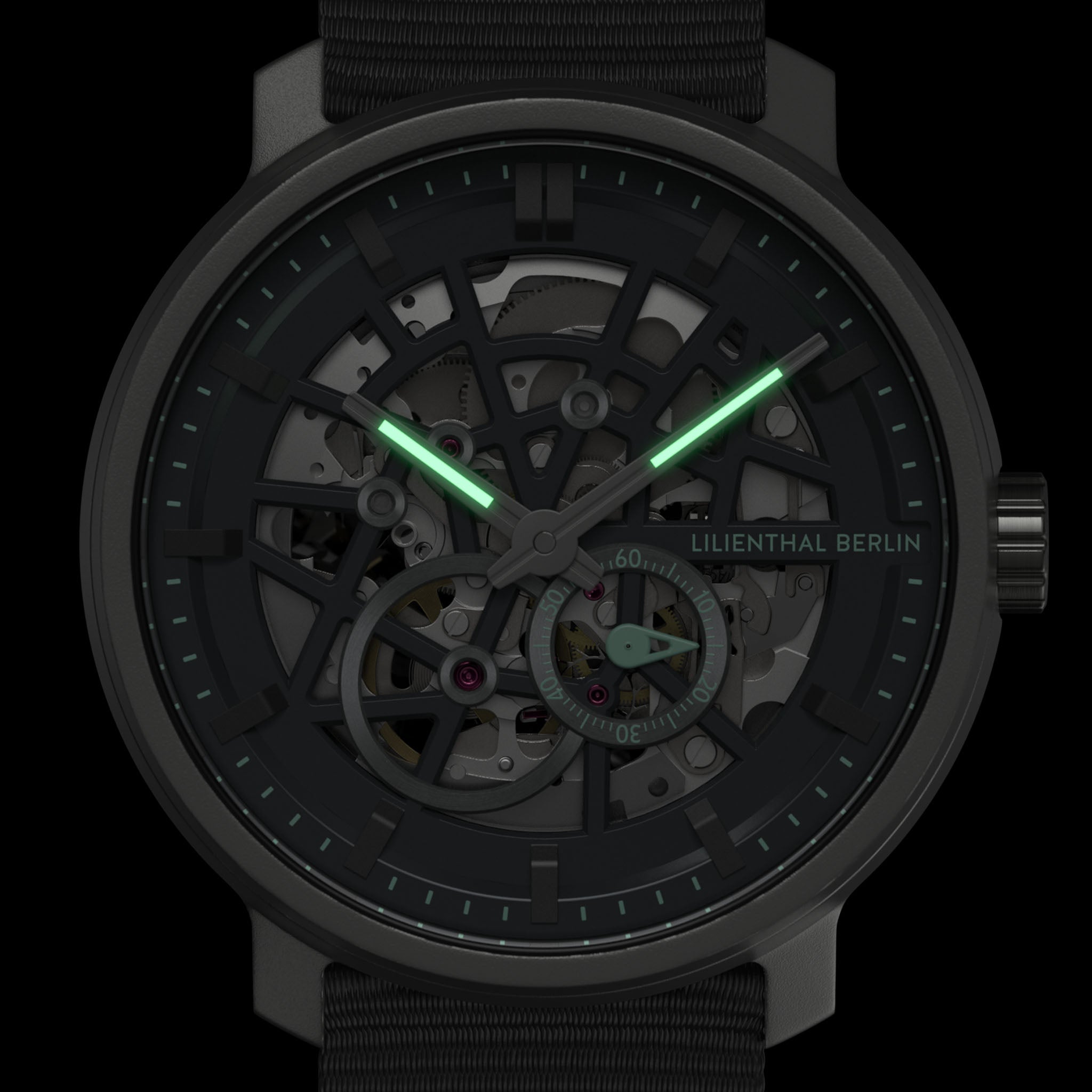 - Precisie zichtbaar gemaakt: De geskeletteerde wijzerplaat onthult de complexe esthetiek van het automatische uurwerk.