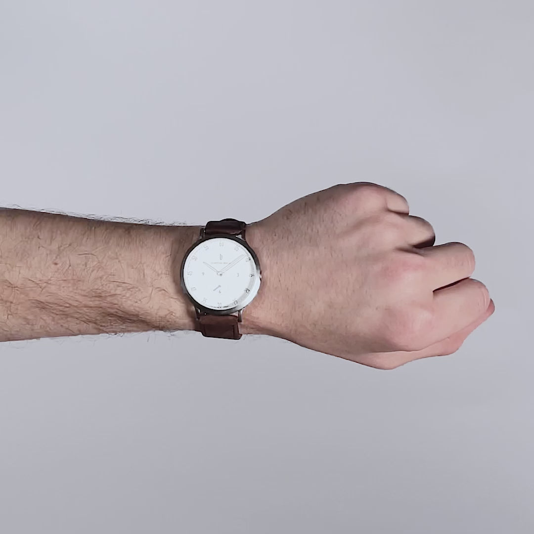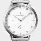• Ikoniczny design: Biała, lakierowana tarcza, koperta 42,5 mm w kolorze srebrnym z wbudowaną koroną i wymiennym paskiem skórzanym – tutaj styl spotyka funkcjonalność.