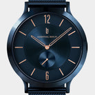 - Ponadczasowy design: Polerowana koperta i tarcza są w głębokim odcieniu niebieskiego. Różowe złote akcenty, takie jak smukłe indeksy i cyfry na pozycjach 12 i 6, dodają nowoczesnego i ponadczasowego charakteru.